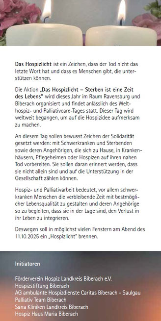 ... ist eine psychosoziale und spirituelle Begleitung von schwerkranken und sterbenden Menschen sowie ihrer Angehörigen in der Häuslichkeit und in Einrichtungen.