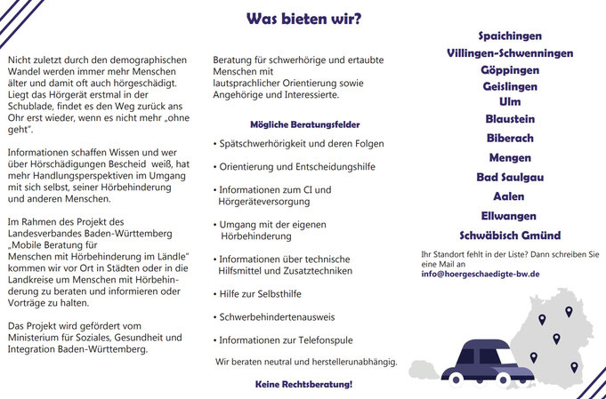 Das Beratungsangebot ist trägerneutral und kostenfrei. Es umfasst unter anderem Informationen zur Hörgeräteversorgung, zum Cochlea-Implantat, zum Umgang mit der eigenen Behinderung, zum Schwerbehindertenausweis sowie zu technischen Hilfsmitteln wie Lichtsignalanlagen, Kommunikationssystemen oder der T-Spule.